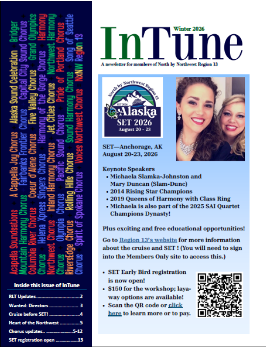 Look for more information about SET 2026 in Anchorage in the next few months. We are looking forward to seeing you on the cruise and at SET 2026 in Anchorage. Feel free to reach out to Cherie Letts with questions / [email protected]. (NOTE: This is not a Sweet Adelines Region 13-sponsored event. It’s an extra feature being offered prior to our SET 2026 event in Anchorage.)